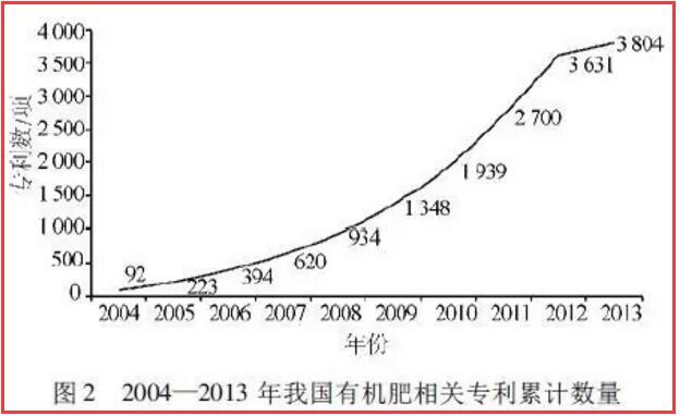 (3)我國有機肥相關(guān)專利累計數(shù)量呈現(xiàn)上升趨勢(圖 2),表明我國有機肥生產(chǎn)技術(shù)在迅速進步和發(fā)展。