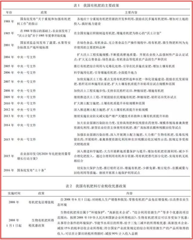 政策可以引導(dǎo)行業(yè)發(fā)展。近年來,中央高度重視有機肥的施用情況,要求各地大力推廣施用有機肥。2004—2016 年,連續(xù)13 年發(fā)布以“三農(nóng)”為主題的中央一號文件,強調(diào)了“三農(nóng)”問題在中國社會主義現(xiàn)代化時期“重中之重”的地位,有機肥作為農(nóng)業(yè)生產(chǎn)的重要環(huán)節(jié),除2011 年以外,12 次被納入歷年中央一號文件作為未來產(chǎn)業(yè)發(fā)展的重點。我國有機肥的主要政策和有機肥行業(yè)稅收優(yōu)惠政策分別見表 1 和表 2。