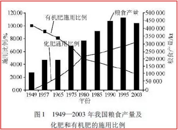 我國是農(nóng)業(yè)生產(chǎn)大國,從古至今,有機肥在我國農(nóng)業(yè)生產(chǎn)中占據(jù)著絕對的主導(dǎo)地位,并隨著我國農(nóng)業(yè)生產(chǎn)的發(fā)展而不斷演變。我國政府十分重視肥料工作,號召廣辟肥源,大力積造有機肥,發(fā)展化肥生產(chǎn),科學(xué)施用肥料。1949—2003 年我國糧食產(chǎn)量及化肥和有機肥的施用比例如圖 1 所示。