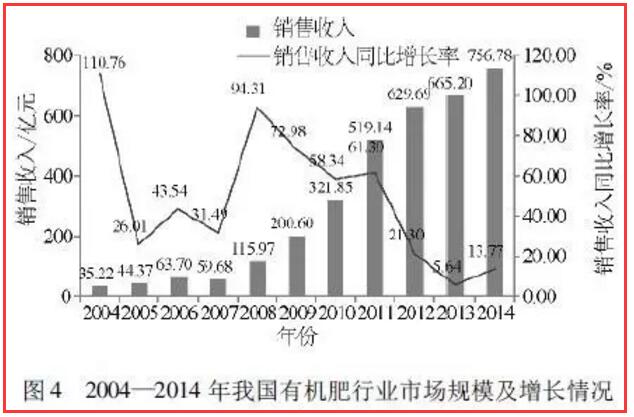 2002 年,我國制訂了有機肥行業(yè)標(biāo)準(zhǔn)NY525—2002,有機肥正式進入流通領(lǐng)域,行業(yè)進入了快速發(fā)展期。經(jīng)過五六年的初步發(fā)展,有機肥的生產(chǎn)技術(shù)趨于成熟,市場需求量不斷擴大,產(chǎn)品豐富多樣,從2008 年開始有了爆發(fā)式的發(fā)展,到2013 年平均銷售額以每年30% 的速度遞增。2004—2014 年我國有機肥行業(yè)市場規(guī)模及增長情況如圖 4 所示。