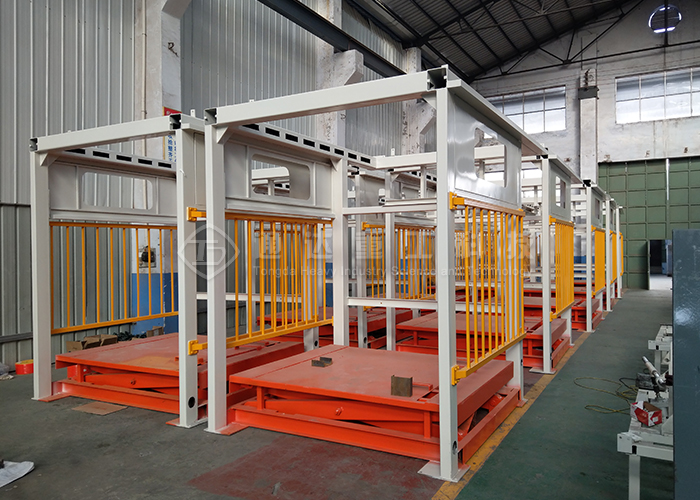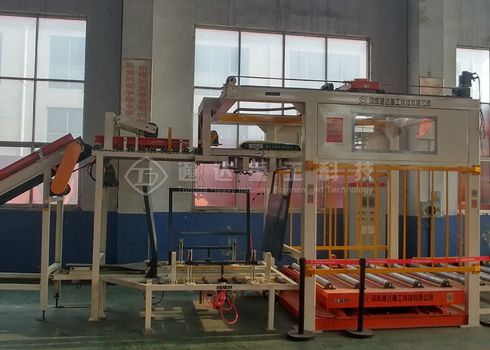 高位機械手碼垛機的工作原理是平板上工件符合棧板要求的一層工件,平板及工件向前移動直至棧板垂直面。上方擋料桿下降,另三方定位擋桿起動夾緊,此時平板復位。各工件下降到棧板平面,棧板平面與平板底面相距10mm,棧板下降一個工件高度。往復上述直到棧板堆碼達到設定要求。